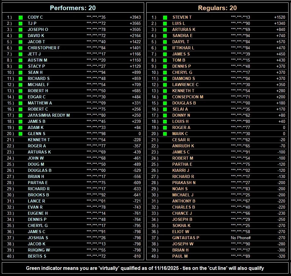 The people in both the performers and regulars lists, who are listed in the 20th position (the last to qualify) are on the "cut line" similar to a golf tournament.