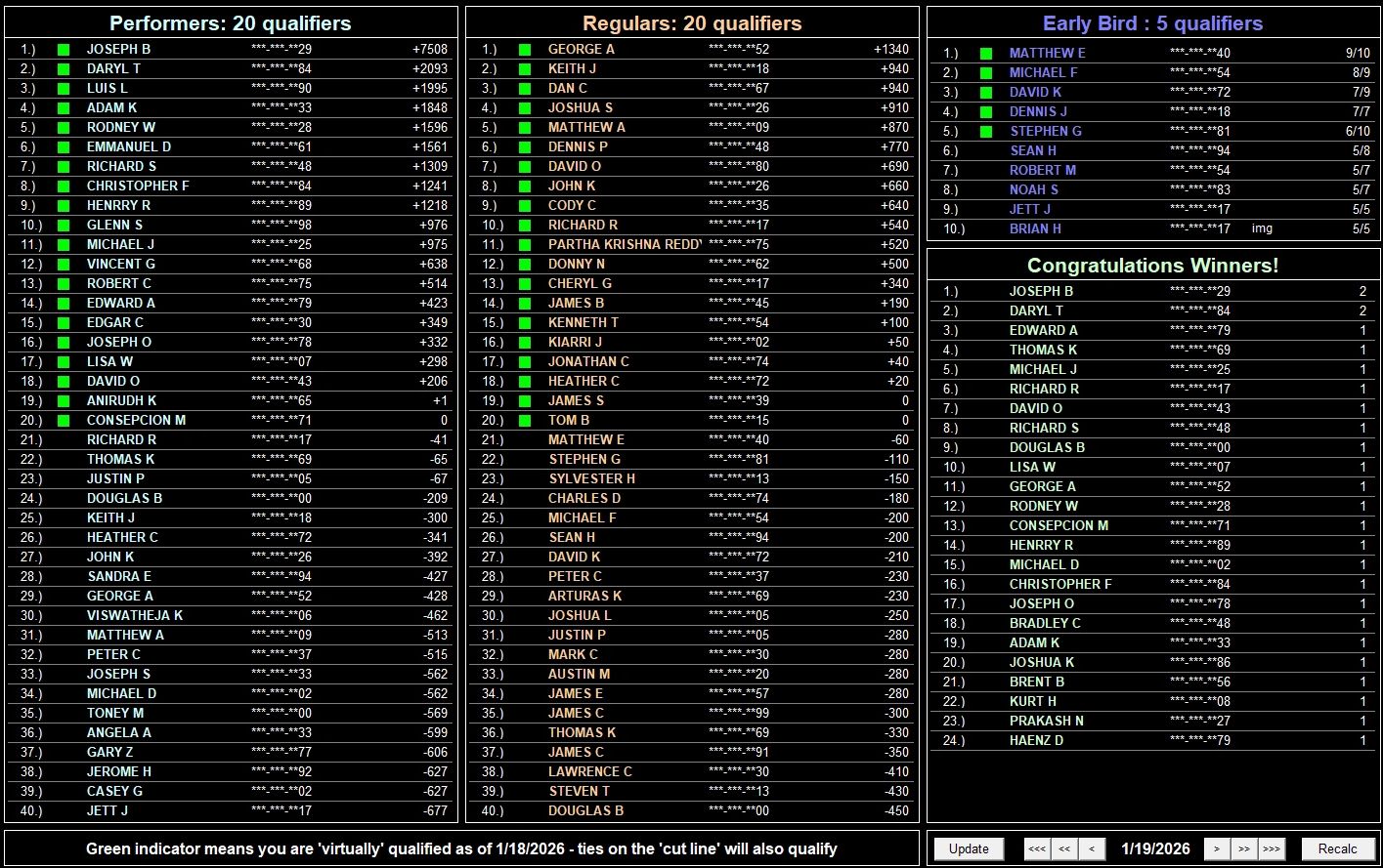 EARLY BIRDS --- We will calculate the total # of tournaments that you registered BEFORE the posted start time. There will be 5 seats available for "early birds" who do not already qualify as a Performer, or a Regular. Ties in this category DO NOT automatically qualify, the ties are broken by comparing the total number of tournaments played in the season, then cumulative buyins, then cumulative cashes (if necessary).